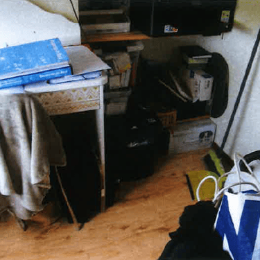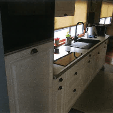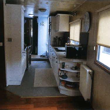 Voorwoning: Woonkamer. kleine keuken, slaapkamer en badkamer met douche